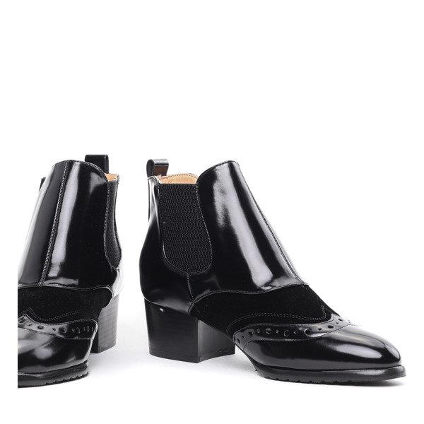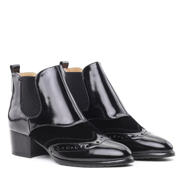 - Retro black lacquer ankle boots. Made of ecological leather. Openwork on the nose. Slip-on upper, two elastic rubbers on the sides for easy donning. No warming inside.