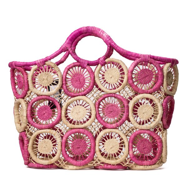• Incredibly stylish shopper bag made of woven paper straw. Two handles at the top. The model looks pink and beige. Perfect for summer stylizac