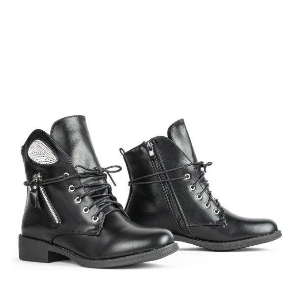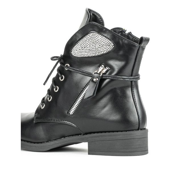 - Women's boots with low flat heels made of eco-leather. Model in black color. Insulated inside in the form of fur. The upper is tied with laces, decorative zipper on the side. Workers have decorative zircons in the upper part.