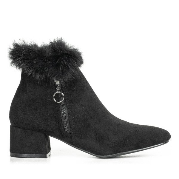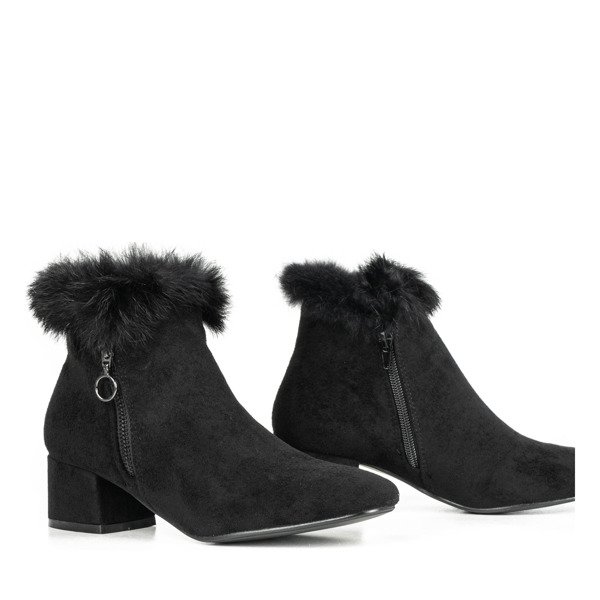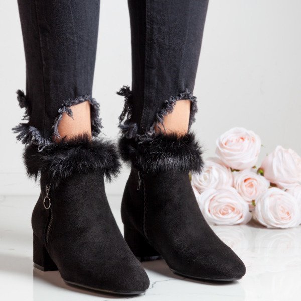 • Black boots on a low post with a square toe made of eco-suede. The upper is decorated with fur and a zipper. The model is fastened with a zipper on the side. In the middle of the insulation in the form of fur. Boots will be a great addition to autumn and