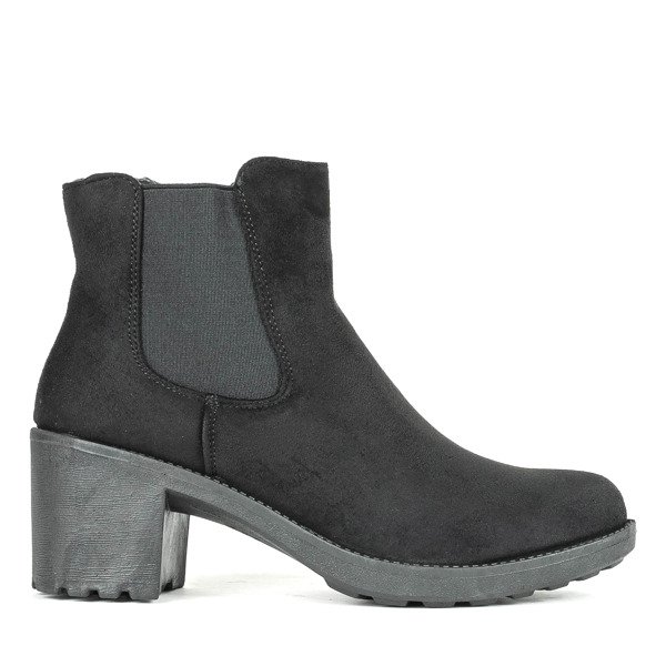 - Black boots on a higher post made of ecological suede leather. The insert inside is made of fabric material. Fastened with a zipper on the side. Perfect shoes for your coat.