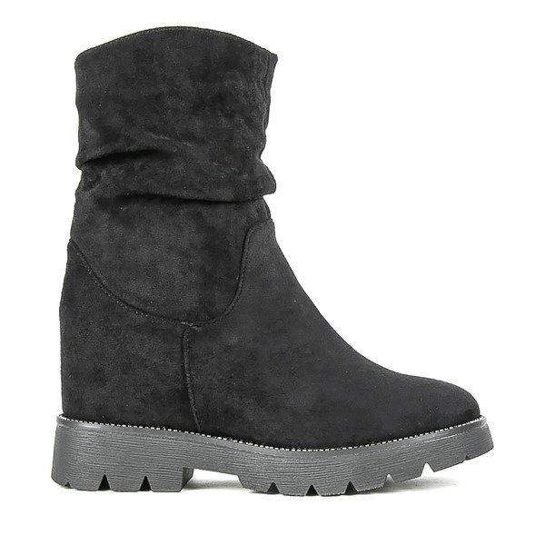 - Solid boots with a covered wedge heel made of black eco-suede. The inside of the shoe is insulated with thick fur. Women's shoes are fastened with a zipper. The sole of the shoe has a cut-out tread. The upper is decorated with ruffles. Perfect for everyda
