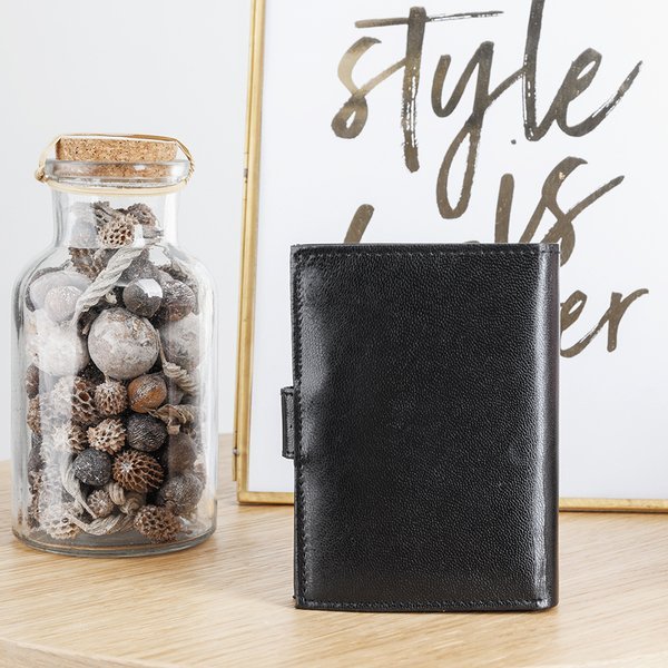 - Small men's wallet made of ecological leather, fastened with a button. The wallet has 2 large compartments, 10 pockets of various sizes and a place for coins.