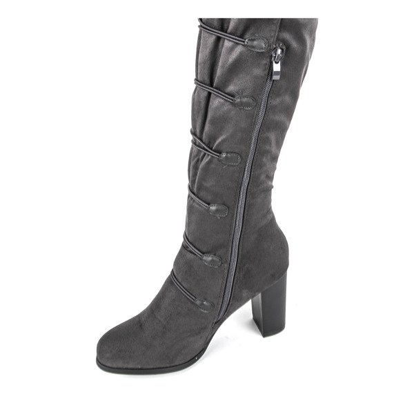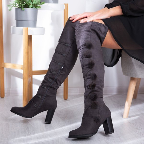 - Lovely boots on a high post with an uppers above the knee. The material is made of gray eco-suede. The center is slightly insulated with fur. Women's shoes are fastened with a zipper. The boots have fur ornaments. Perfect for cold days!