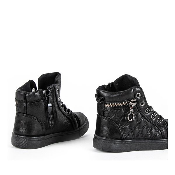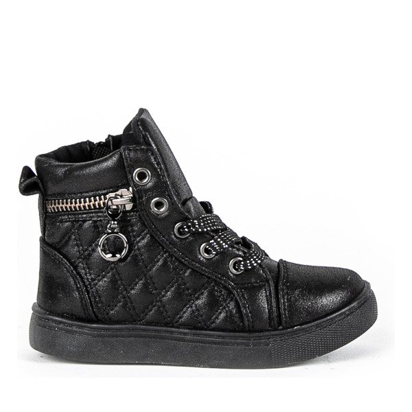 - Cute girls' boots on a black sole. Upper made of thick quilted fabric in black. Children's shoes have a binding and a zipper on the inside. NOTE: Some models may have small discoloration on the sole.