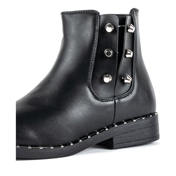 • Stylish women's ankle boots with flat heels. Made of ecological leather in black. The model is fastened with a zipper on the side. The upper is decorated with metal elements and studs. Inner lined with a delicate fur.