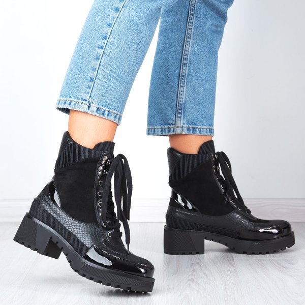 - Stylish bags on a sturdy post. The upper is a combination of black eco-suede and eco-leather with an animal pattern. The inside of the shoe is insulated with fur. The boots have lacing. They go great with trousers and winter clothing!
