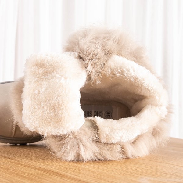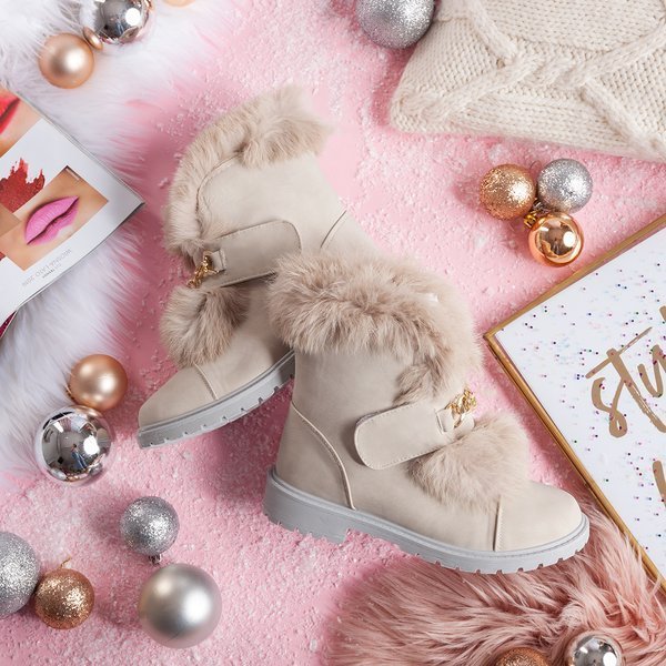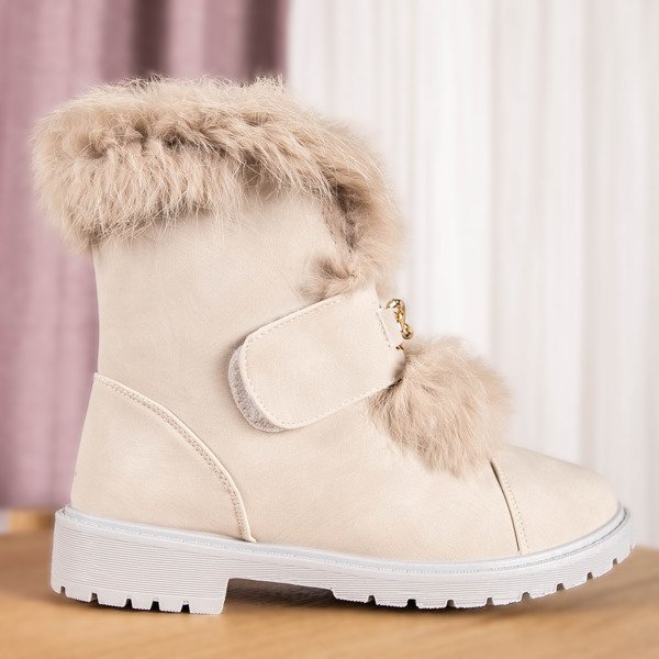 - Fur insulated boots with flat heels. The material is made of matte eco-leather in a beige color. The presented footwear has a comfortable Velcro closure. The sole has a cut tread.