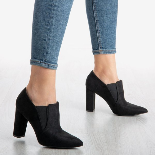 - Boots on the post made of eco-friendly suede in black. The insole is made of eco-leather. The shoes are slipped on. Inserts made of flexible material make it easier to put on the shoe. The toe toe slenderized the leg. Perfect for every day.