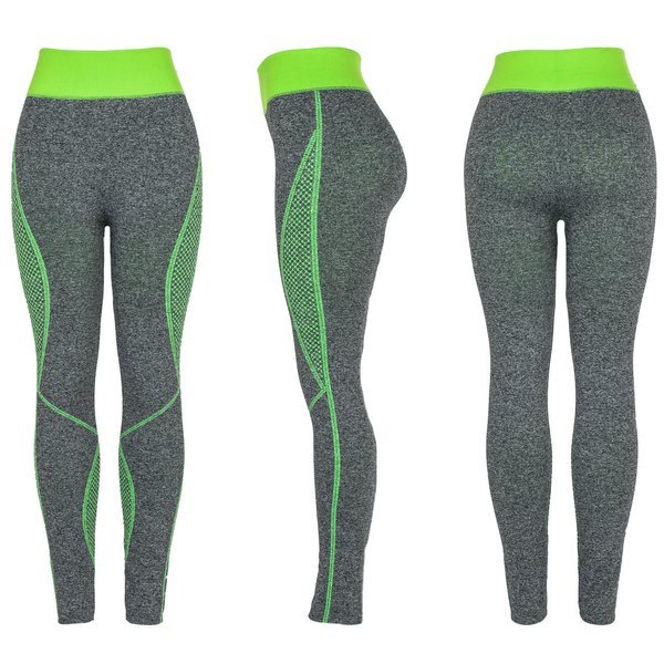 - Elastic gaiters made of thick fabric. Leggings are gray and have green inserts. The presented clothing can be used as sports underwear for outerwear. NOTE: Measurement accuracy (+/-) 1 cm.