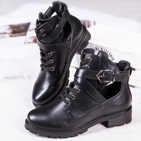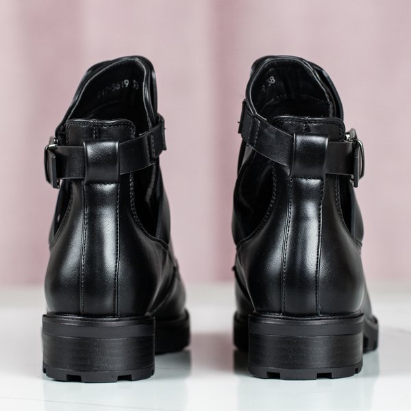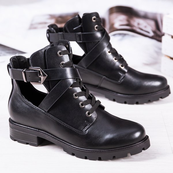 - Boots with flat heels and cut upper. Made of black eco-leather. The inside of the shoe is lined with fabric. Fastening with a decorative buckle and lacing. Sole with cut tread. For everyday styling!