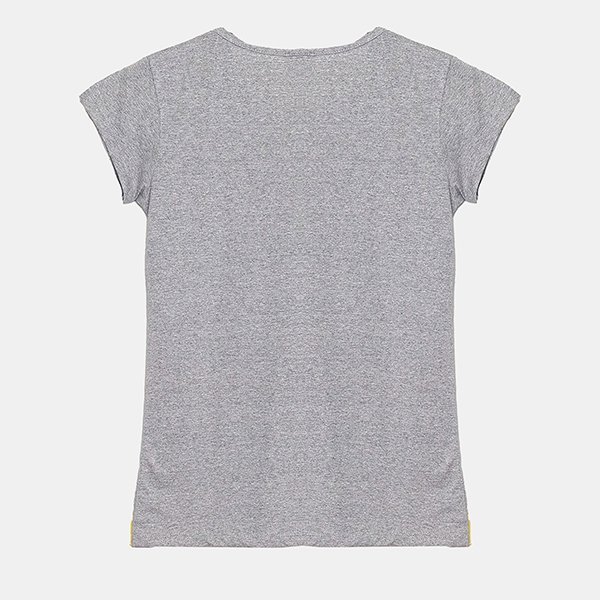 - Women's T-shirt with short sleeves. The model is made of gray fabric. The product has a decorative print on the front. Perfect for shorts. Before buying, check the size