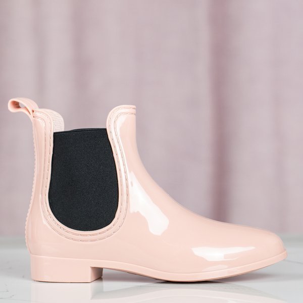 - Beige varnished galoshes on a flat heel. Material - rubber material. Inside a rubber insert. Product with almond toe. Presented women's footwear is a great addition for rainy days.