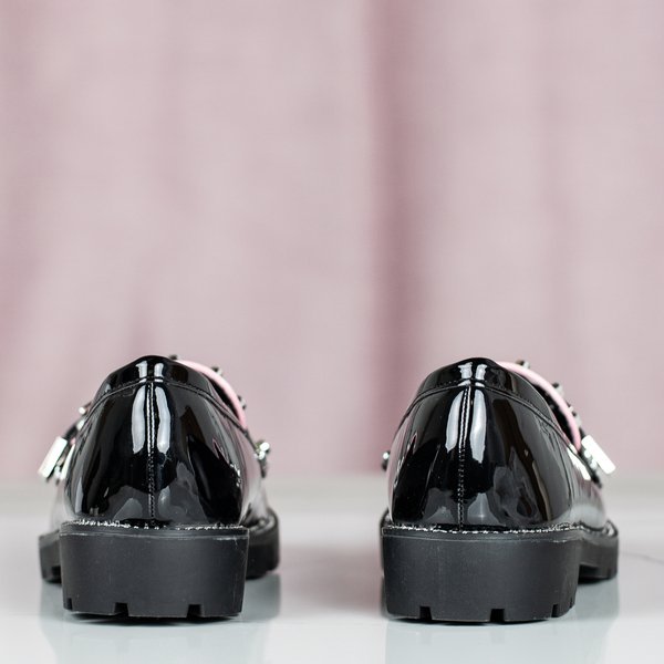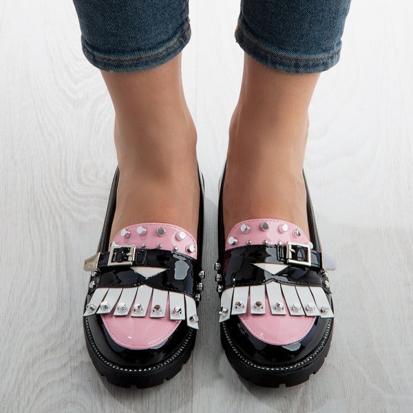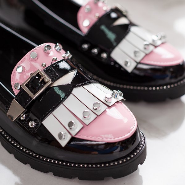 - Tasteful black women's loafers with flat heels. The model is made of patent ecological leather. The toe has a pink insert, white fringes, a buckle and silver studs. Sole decorated with cubic zirconia.