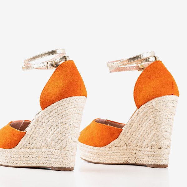 • Classic espadrilles fastened with a buckle, made of orange eco-suede. The wedge is covered with a braided jute cord. The insole is covered with eco-leather. For summer styling!