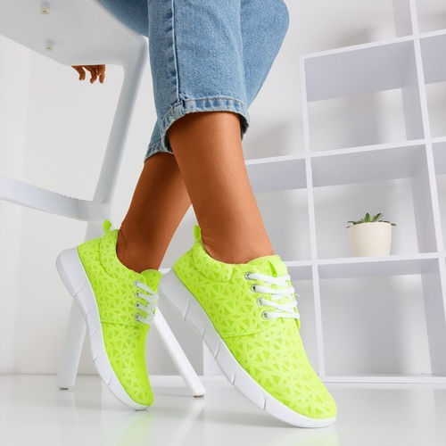 - Neon green women's sports shoes made of fabric material. Lace-up upper, decorated with patterns. The insole is also a fabric. Perfect for active time!