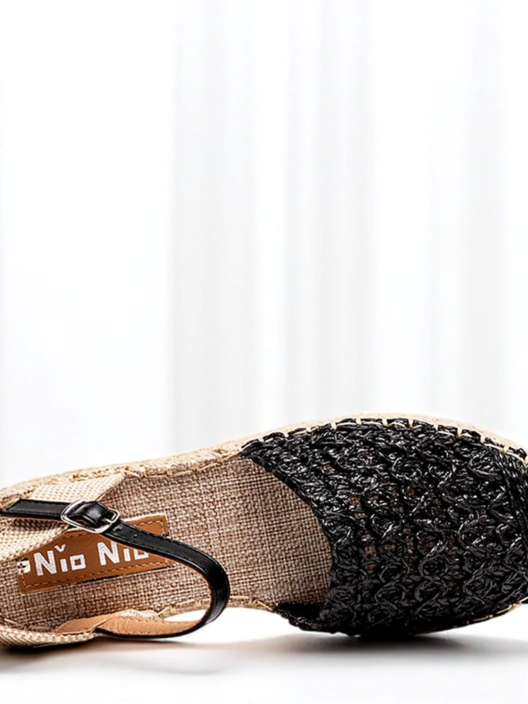 - Ladies' black espadrilles on a low platform. The upper is made of plastic. The sole is decorated with a braided jute cord around it. The model is fastened with a buckle. Fabric guide. Perfect for summer.