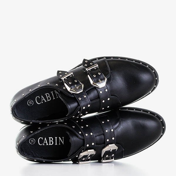 - Sensational women's shoes made of ecological leather in black. The upper is finished with small silver jets. The model is fastened with two buckles. Perfect for elegant and fashionable stylizations!