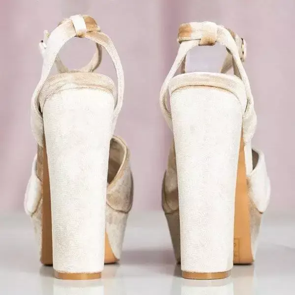 - Beige high-heeled sandals made of velor material. Burgundy color model. Women's shoes are fastened with a buckle on the ankle. Perfect shoes for warmer days. Note: the product has traces of glue on the material.