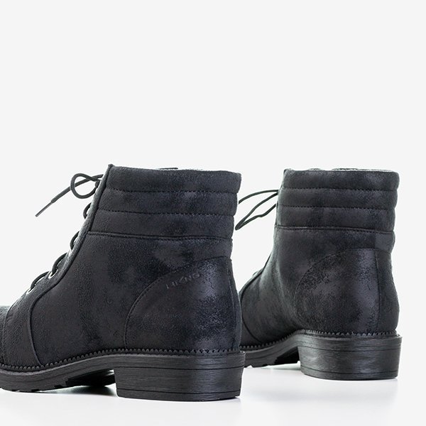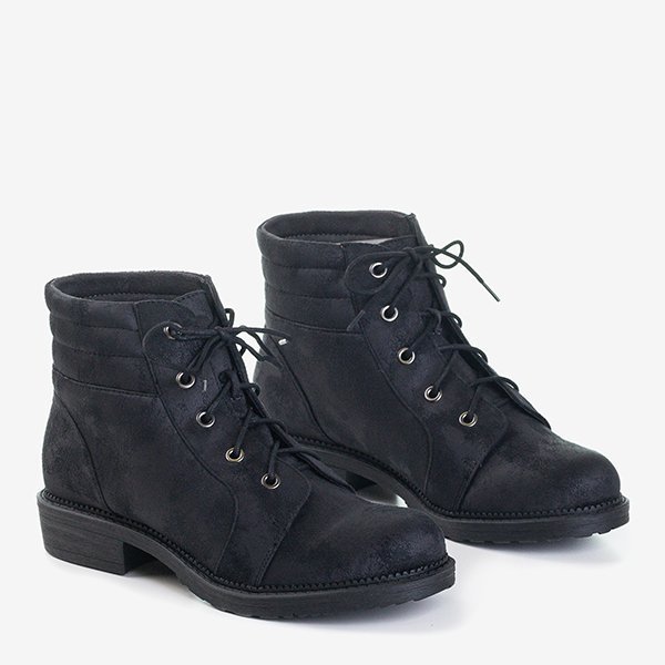 - Women's flat-heeled boots made of eco-suede leather with decorative abrasions. Workers in black color, tied with laces. The perfect addition to your fall / winter outfit.