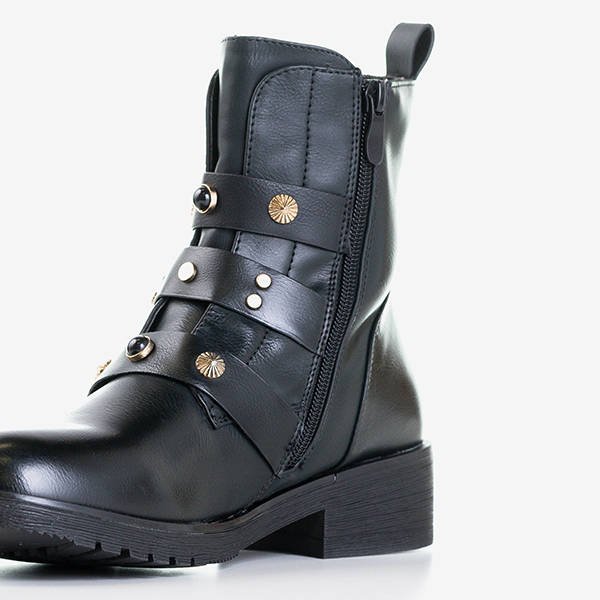 - Women's flat-heeled boots made of ecological leather in black color. Inner lined with fur. The model is decorated with golden buckles and pins, fastened with a zipper. Perfect for rock stylizations!