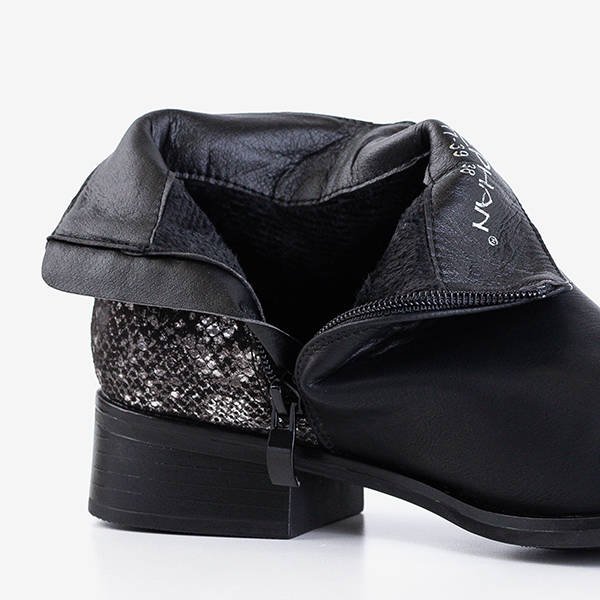 - Original women's boots with flat heels in black color. The upper is made of ecological leather, in the back part has a fabric insert, which is decorated with a snake skin print. The model is fastened with a zipper on the side.