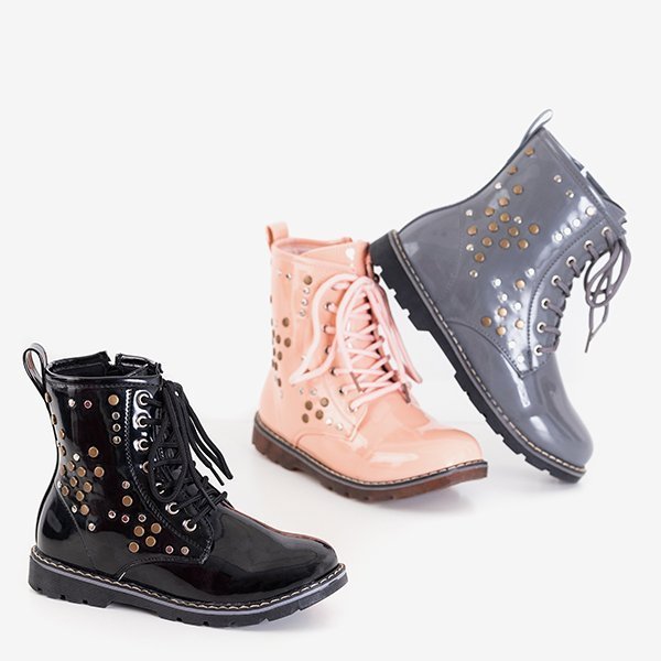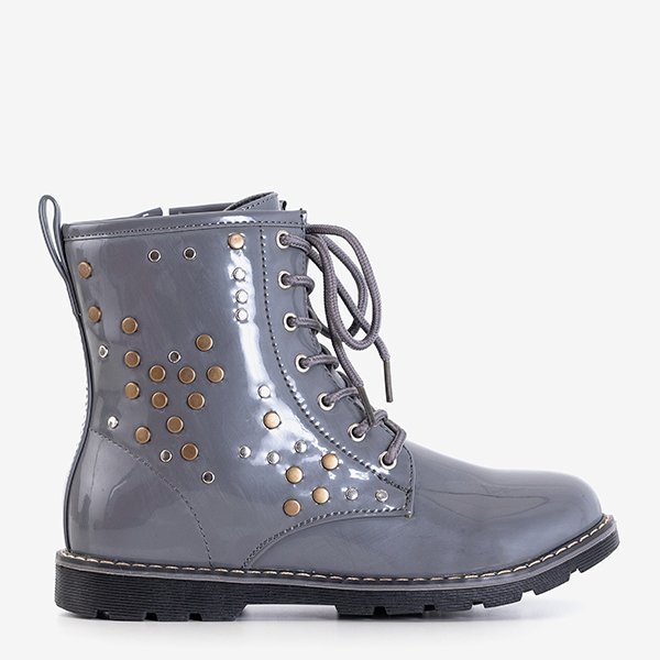 • Stylish children's bags, made of gray lacquered ecological leather. Lace-up model and zipper on the side. The upper is decorated with metal jets. The inside of the shoe is lined with soft foam, and the insole is made of fabric.