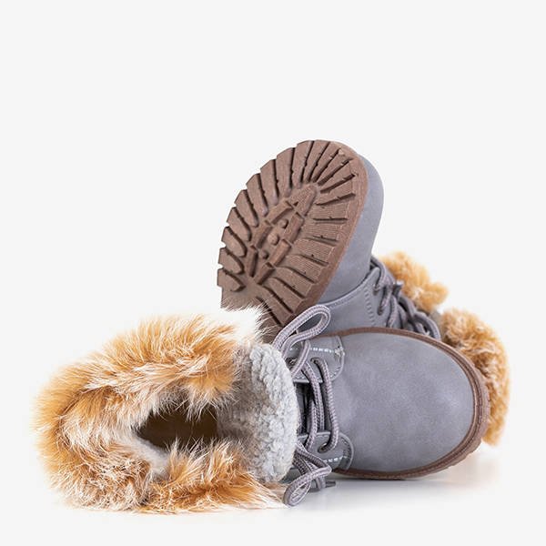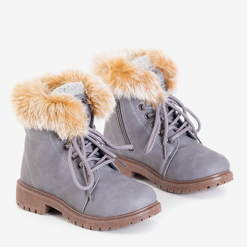 • Comfortable children's hiking boots in gray, made of matte ecological leather. The model is insulated with soft fur and sheepskin. The shoes are lace-up and zipped on the side. Decorative studs on the tongue.
