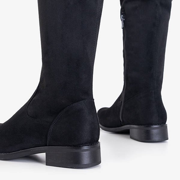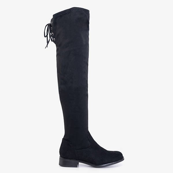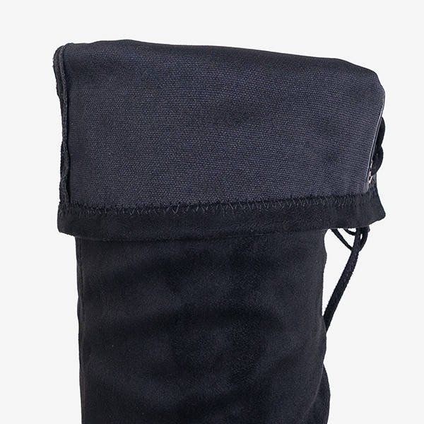 - Stylish women's over-the-knee boots, made of organic suede leather. The model is zippered to the middle of the calf, insulated with fur inside in the lower part. At the back they have a drawstring, with which you can adjust the width of the upper part.