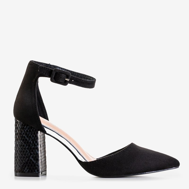 - Elegant women's pumps on a stable post with embossing, made of soft eco-suede, cut-outs on the side. Pointed nose, insole made of eco-leather, fastened at the ankle with a buckle.