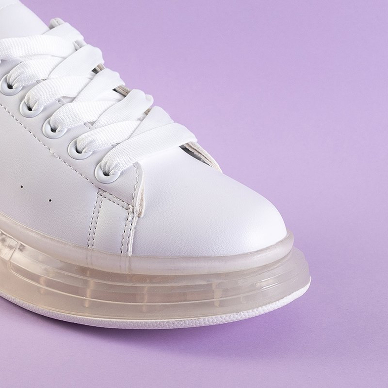 - Women's sports shoes made of ecological leather in white color. The model with a lace-up upper and has a colored insert on the heel. The uniqueness is given by the transparent rubber sole. A perfect addition to a sports outfit.