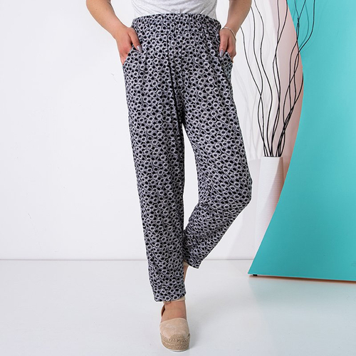 • Patterned women's fabric pants made of soft cotton. The model has an elastic band at the waist and legs, two slip pockets on the front. A great proposition for warm summer days! NOTE: Measurement accuracy (+/-) 1 cm.