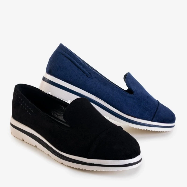 • Lightweight women's moccasins on a heel, made of eco-suede leather. The insole is lined with eco leather. Very comfortable thanks to the soft rubber sole. Note: the product has discoloration on the material.