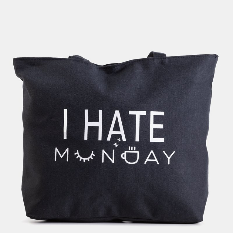• Classic shoulder bag made of soft fabric with decorative lettering on the front. Fastened with a zipper. Inside a large compartment and a small zippered pocket. Perfect for shopping!