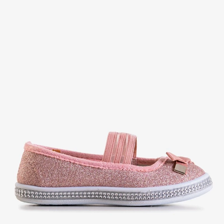 - Mega stylish girls' ballerinas on a flat sole decorated with cubic zirconia. The upper is made of glitter fabric, in the middle a fabric insert. Note: Some decorations are missing from the product.