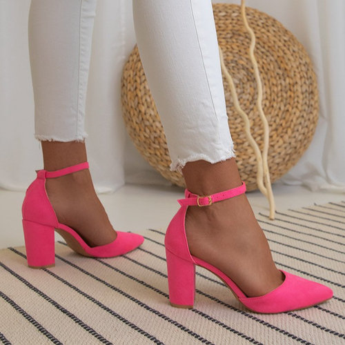 - Beautiful women's sandals on a stable post - a combination of classic, elegance and comfort! They are made of soft eco-suede, and the insole is eco-leather. The tapered toe optically slims the legs. A strap fastened with a buckle around the ankle.