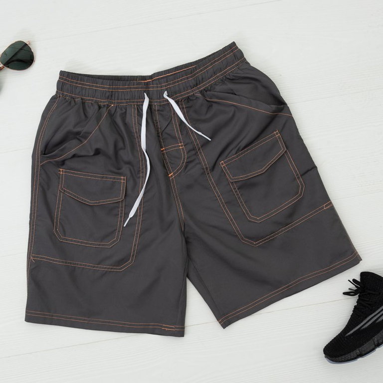 - Men's short shorts made of stretchy material - perfect men's shorts for summer! The model has 6 pockets, elastic waistband and ties, and mesh inside. NOTE: accuracy of measurement (+/-) 1 cm. Dimensions measured flat.