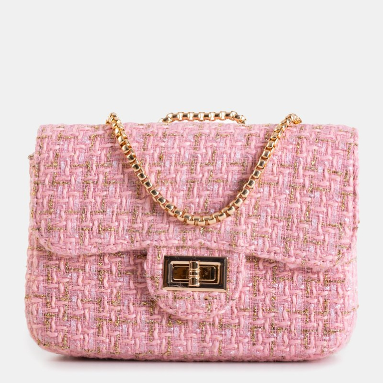 - Beautiful tweed women's handbag made of boucle fabric with a structured weave. Charming and fashionable design. Eco-leather lining inside. The model has one outer pocket and one inner pocket. Fastened with a rotary button.