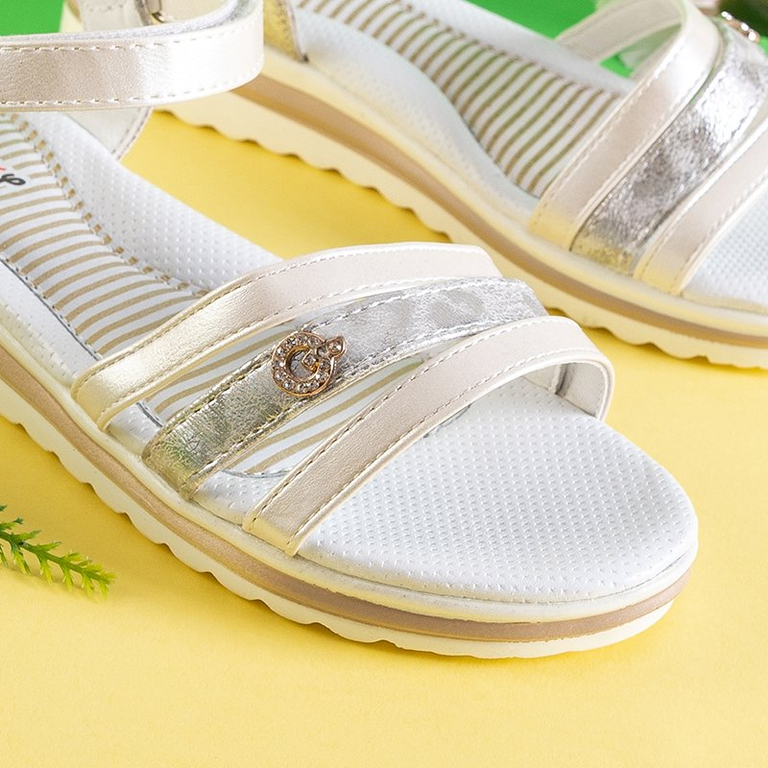 - Classic girls' sandals on a delicate wedge heel, made of ecological leather with a shiny finish. The model is fastened with Velcro around the ankle, the insole is lined with eco-leather. They look lovely on a child's foot.