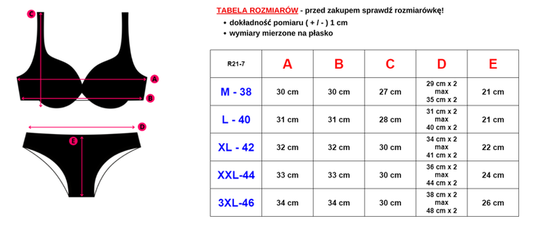 - Swimsuit set consisting of a bra and high-waisted bottoms. Push-up bra, with adjustable straps and fastening at the back. The panties have a safety insert before first use. NOTE: Measurement accuracy (+/-) 1 cm.