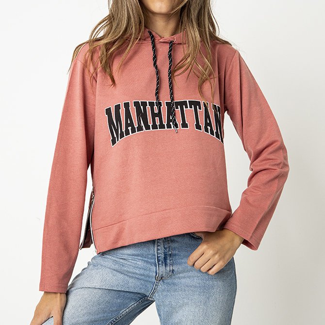 • Sensational sweatshirt with inscription "MANHATTAN", made of viscose material. The model is inserted over the head, has a hood adjustable with straps, on the lower right side - a decorative zipper. It is ideal for tracksuits. NOTE: Measurement accuracy (+