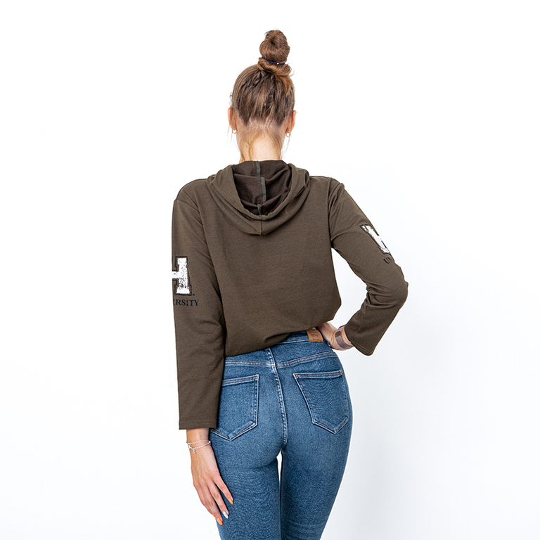 - Stylish women's cropped sweatshirt with inscriptions, made of viscose material. Slipped-over model, it has a hood, strings and an elastic band at the bottom. NOTE: Measurement accuracy (+/-) 1 cm.