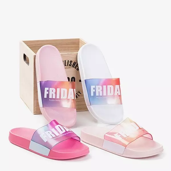 - Women's slippers made of dark pink rubber material. Transparent stripe with inscriptions. Take these swimming shoes with you! Note: the product has dirt on the material.