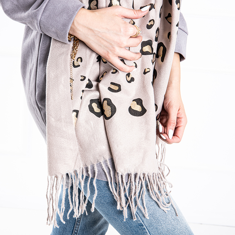 - Beautiful ladies warm scarf, perfect for fall and winter. Decorated with gold inserts and tassels on the sides.