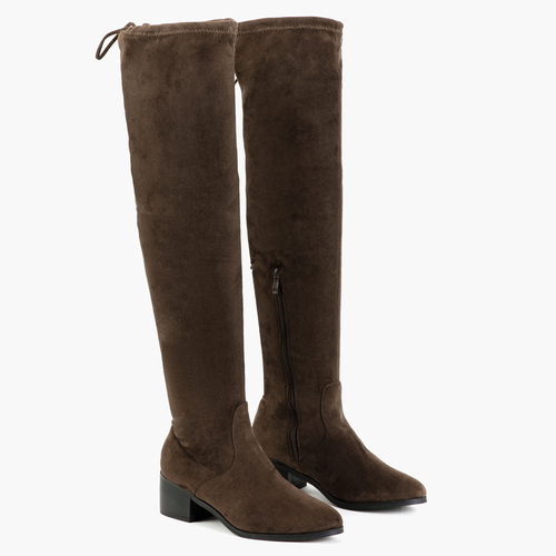 - Stylish women's over-the-knee boots, fastened to the mid-calf. Made of eco-suede leather, while the insole is made of furry material. At the back they have a drawstring, with which you can adjust the width of the upper. Insulated model.