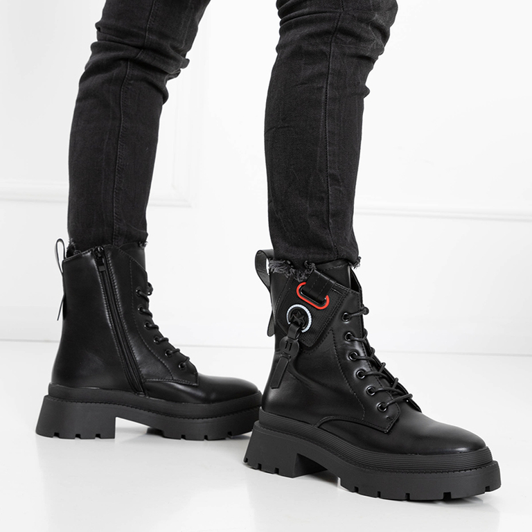 - Mega stylish women's boots a'la workery with decorations on the upper. The model is made of ecological leather, the inside is lined with a delicate fur. The perfect base for many everyday looks! BLACK INSULATED SHOES SIDORA TRAPER ANKLE BOOTS