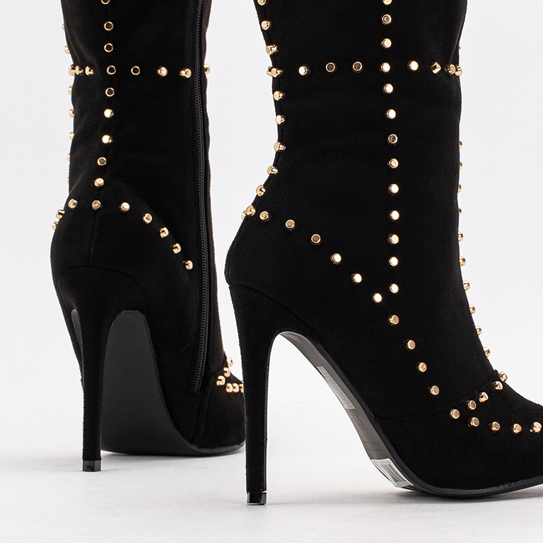 - Elegant women's high stiletto boots, made of eco-suede leather. Footwear zippered, has gold (sewn) ornaments, eco-leather insole, no insulation. BLACK WINTER BOOTS BOOTS ON STILETTO HEEL RASHIOU