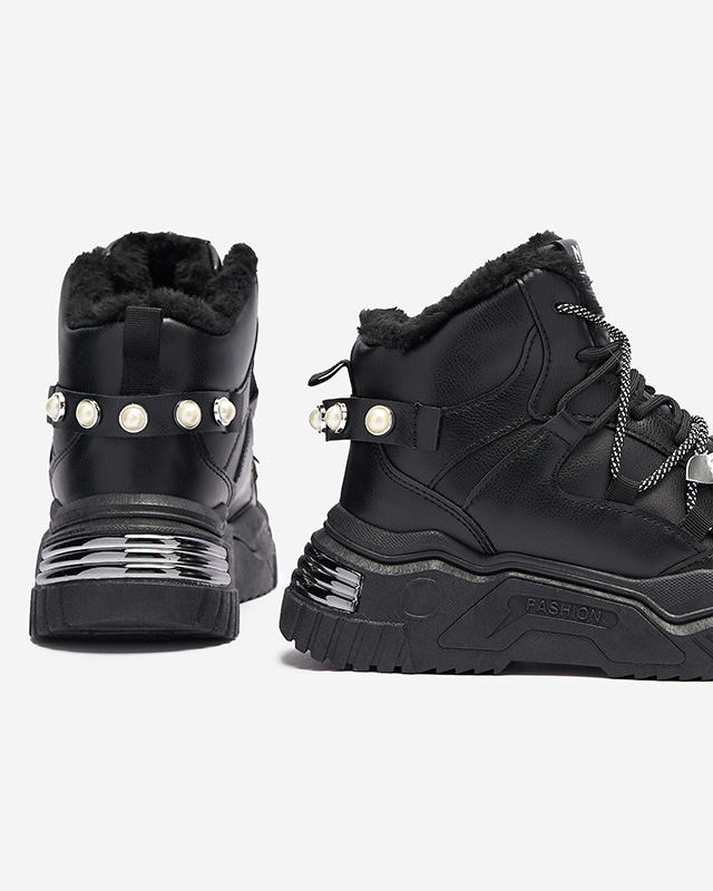 • Women's sports sneakers insulated with fur on a massive sole. The model is decorated with decorative inserts and pearls, tied with double lacing. Perfect for colder days for everyday outfits!