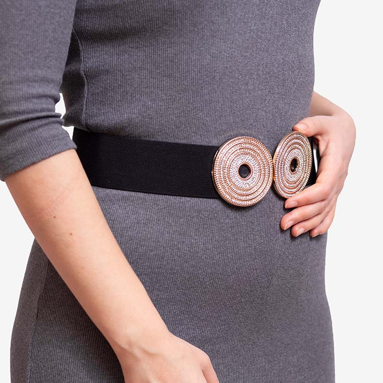 - Great wide belt for women with golden buckle with zircons. The model is made of a combination of ecological leather and rubber. This eye-catching model fits perfectly with dresses and pants.