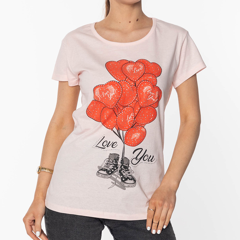 • Ladies' Cotton T-shirt with short sleeves and round neckline. On the front, the T-shirt is decorated with a print. Perfect for summer! NOTE: Measurement accuracy (+/-) 1 cm.